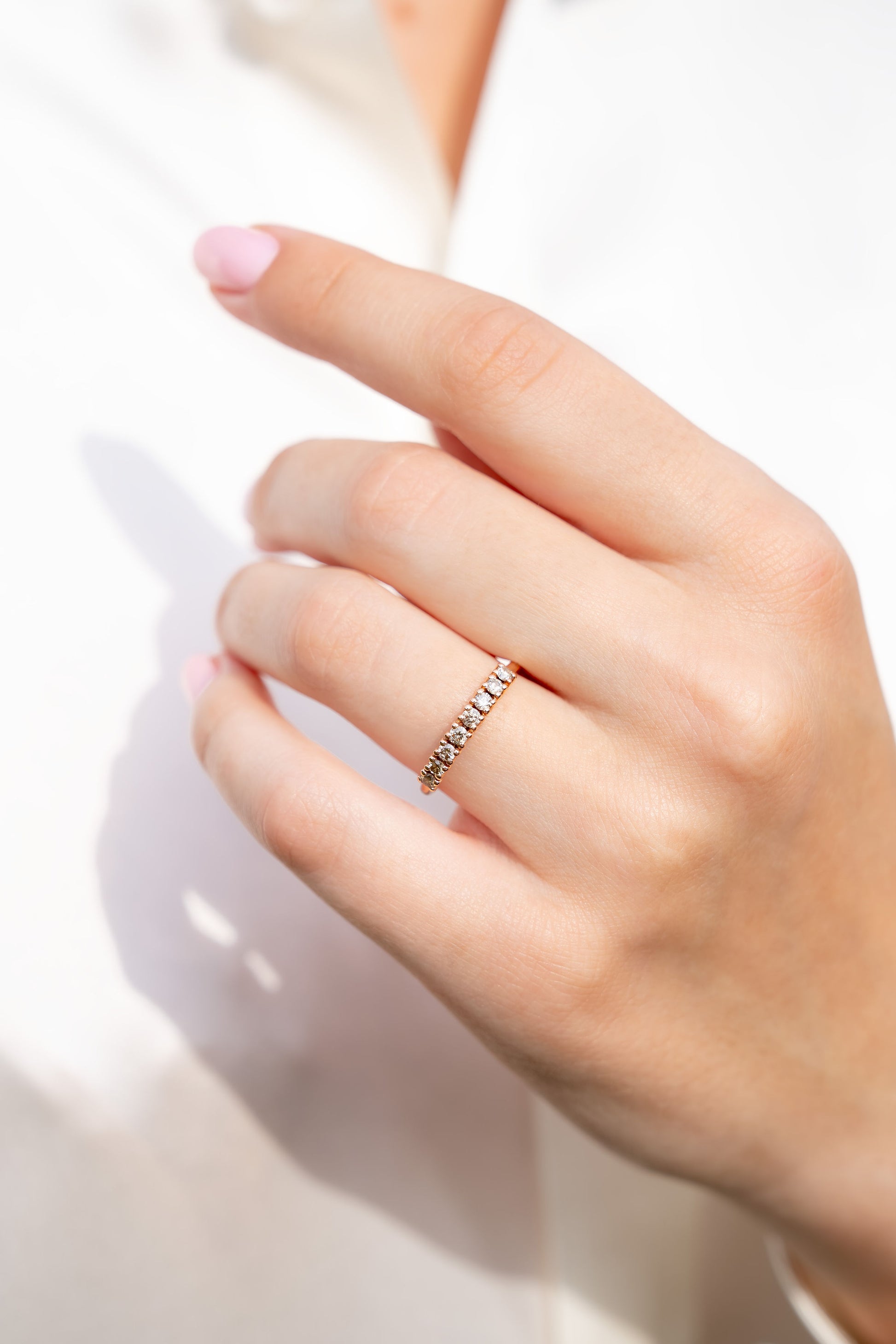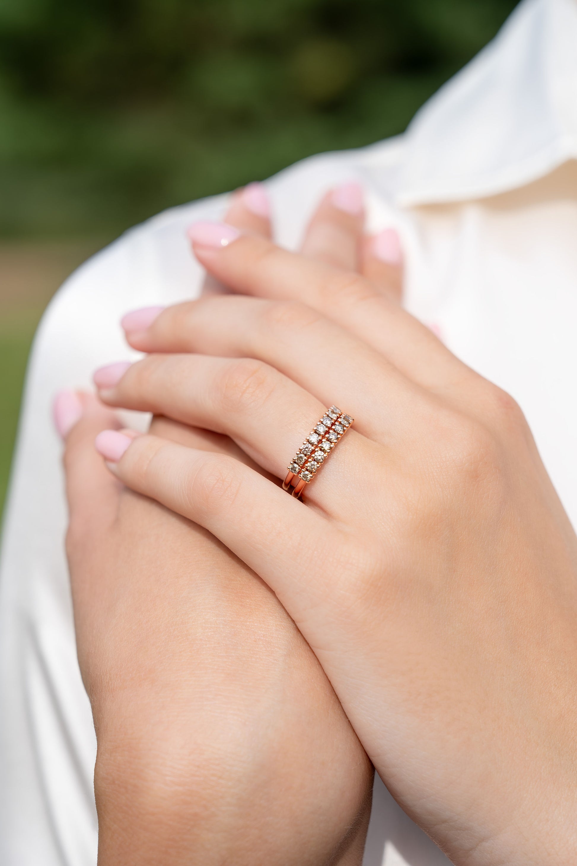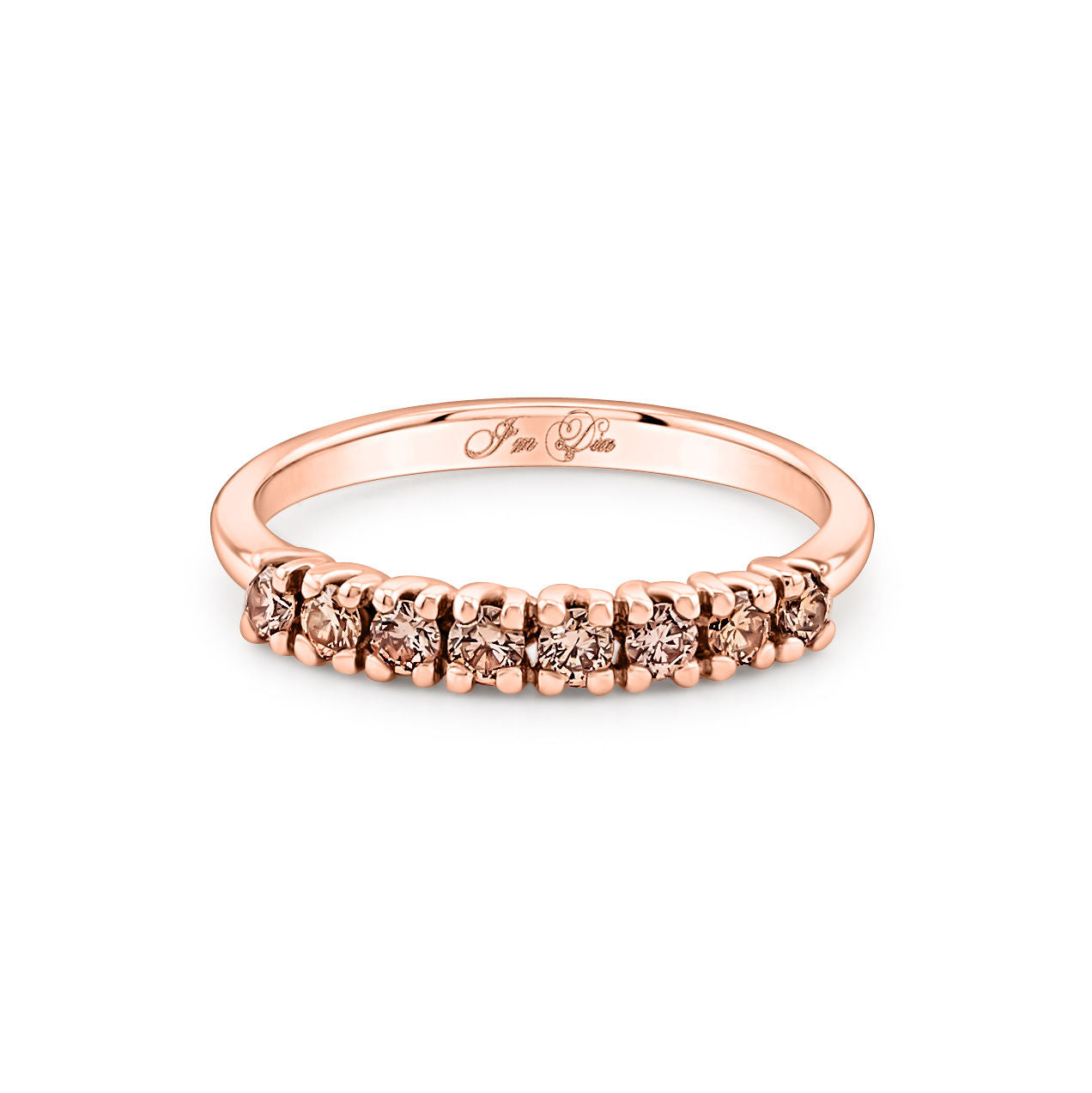 Parodome savo pirmąjį gražuolį - deimantų juostelės žiedelį. Rausvas auksas buvo pasirinktas ne veltui, nes tik jame atsiskleidžia visas spektras konjako spalvos deimantų žvilgesio. Šis duetas iš tiesų žvilga užburiančiai.